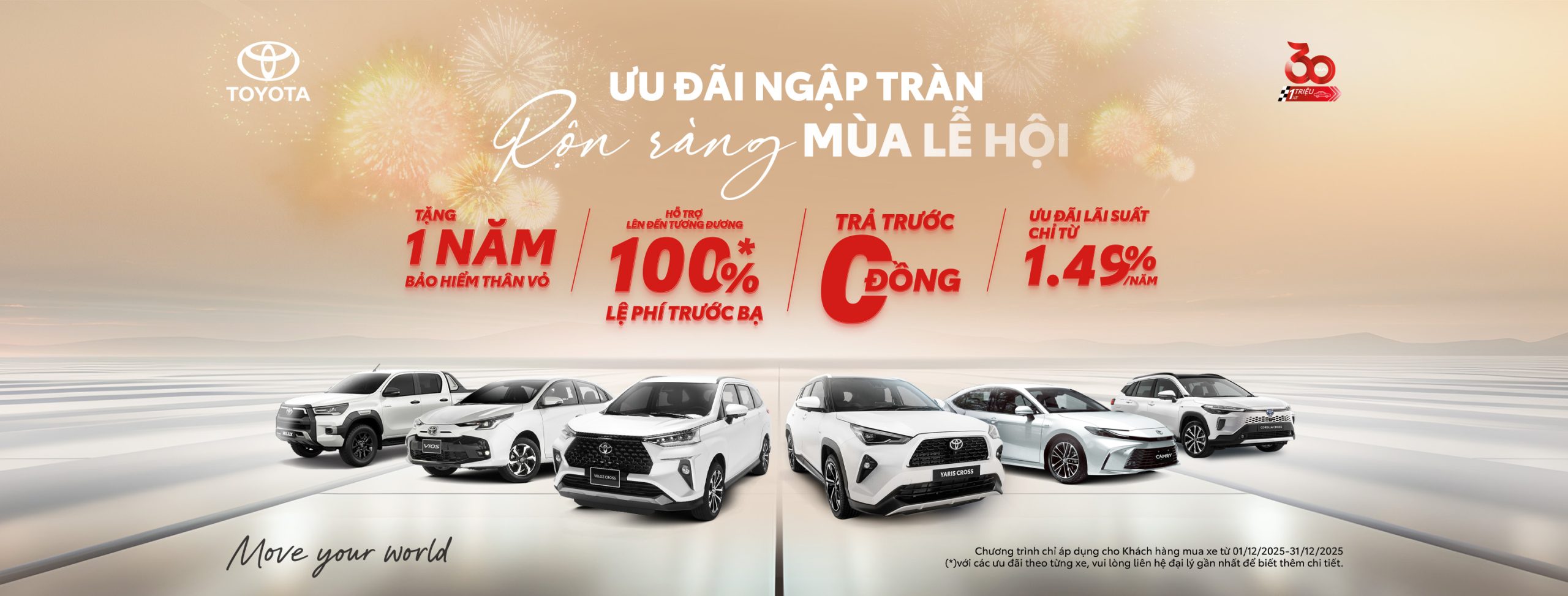 Không khí lễ hội đang dần rộn ràng khắp phố phường. Đây là thời điểm tuyệt vời để khởi động những chuyến đi cuối năm đầy hứng khởi. Cùng Toyota lăn bánh trên hành trình khám phá mới, tận hưởng ưu đãi hấp dẫn dành riêng cho tháng 12 và sẵn sàng đón chào mùa lễ hội theo cách của riêng bạn. ✅ Sở hữu xe Veloz Cross và Avanza Premio cho cả gia đình: Hỗ trợ lên đến tương đương 100% lệ phí trước bạ + Ưu đãi lãi suất từ 1.99%/năm + Tặng 01 năm bảo hiểm thân vỏ. ✅ Nhận ưu đãi cuối năm dành cho mẫu xe sedan Vios: Hỗ trợ lên đến tương đương 100% lệ phí trước bạ + Ưu đãi lãi suất từ 1.99%/năm. ✅ Định chất riêng mùa lễ hội cùng mẫu xe SUV Yaris Cross: Hỗ trợ lên đến tương đương 50% lệ phí trước bạ + Ưu đãi lãi suất chỉ từ 1.49%/năm + Tặng 01 năm bảo hiểm thân vỏ. ✅ Lăn bánh mẫu xe Corolla Cross phong cách: Hỗ trợ lên đến tương đương 50% lệ phí trước bạ + Ưu đãi lãi suất chỉ từ 1.49%/năm. ✅ Sở hữu mẫu sedan sang trọng Camry: Hỗ trợ lên đến tương đương 100% lệ phí trước bạ + Ưu đãi lãi suất chỉ từ 1.49%/năm. ✅ Lăn bánh mẫu xe bán tải Hilux: Hỗ trợ lên đến tương đương 50% lệ phí trước bạ. ✅ Chương trình vay hấp dẫn “Trả trước 0 đồng" Lăn bánh xe mới, nhận ưu đãi dành cho khách hàng trong tháng 12 này để đón chào hành trình mùa lễ hội rực rỡ! 👉Chương trình áp dụng từ ngày 01/12/2025 đến 31/12/2025.
