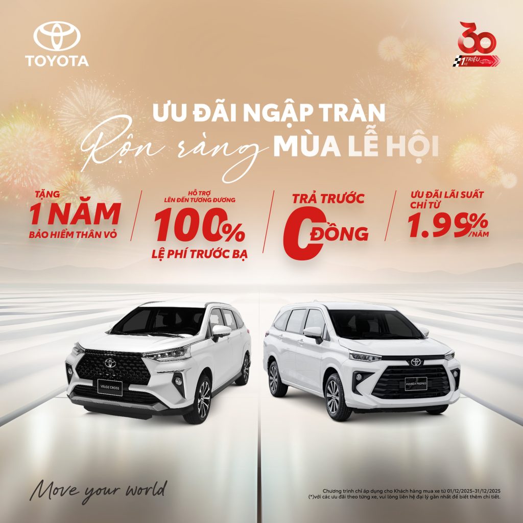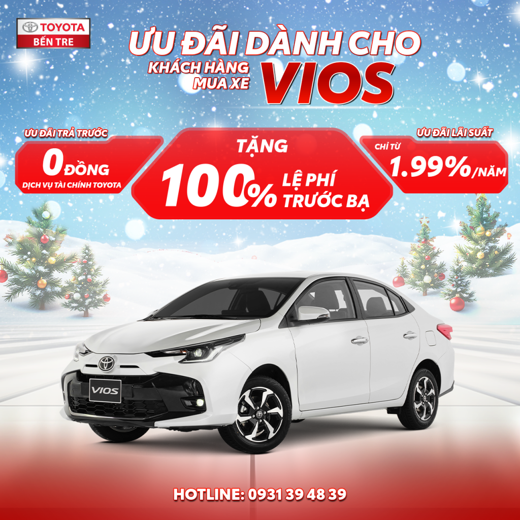 Không khí lễ hội đang tràn ngập khắp nơi, đây chính là THỜI ĐIỂM VÀNG để bạn hiện thực hóa giấc mơ xe mới, khởi động những hành trình cuối năm đầy hứng khởi bên gia đình và người thân. Toyota Bến Tre mang đến gói ưu đãi ƯU VIỆT VÀ TOÀN DIỆN NHẤT trong tháng 12 này. Lăn bánh xe mới, nhận ngay “Lộc Vàng” rực rỡ