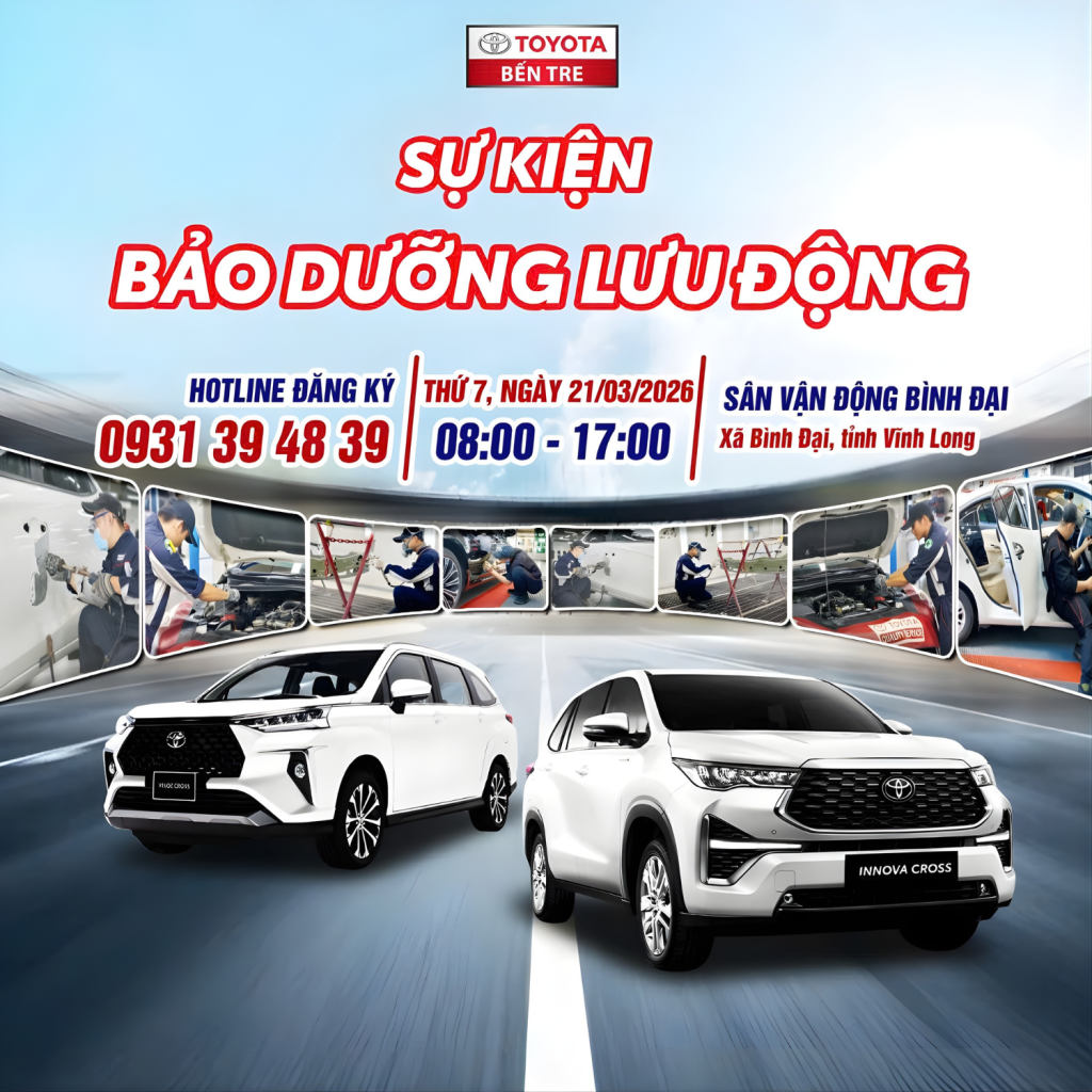 Chào các bác tài tại Bình Đại! Nhằm mang lại sự tiện lợi tối đa và giúp Quý khách tiết kiệm thời gian, chi phí di chuyển, Toyota Bến Tre chính thức đổ bộ chương trình Bảo dưỡng lưu động đặc biệt trong tháng 3 này.